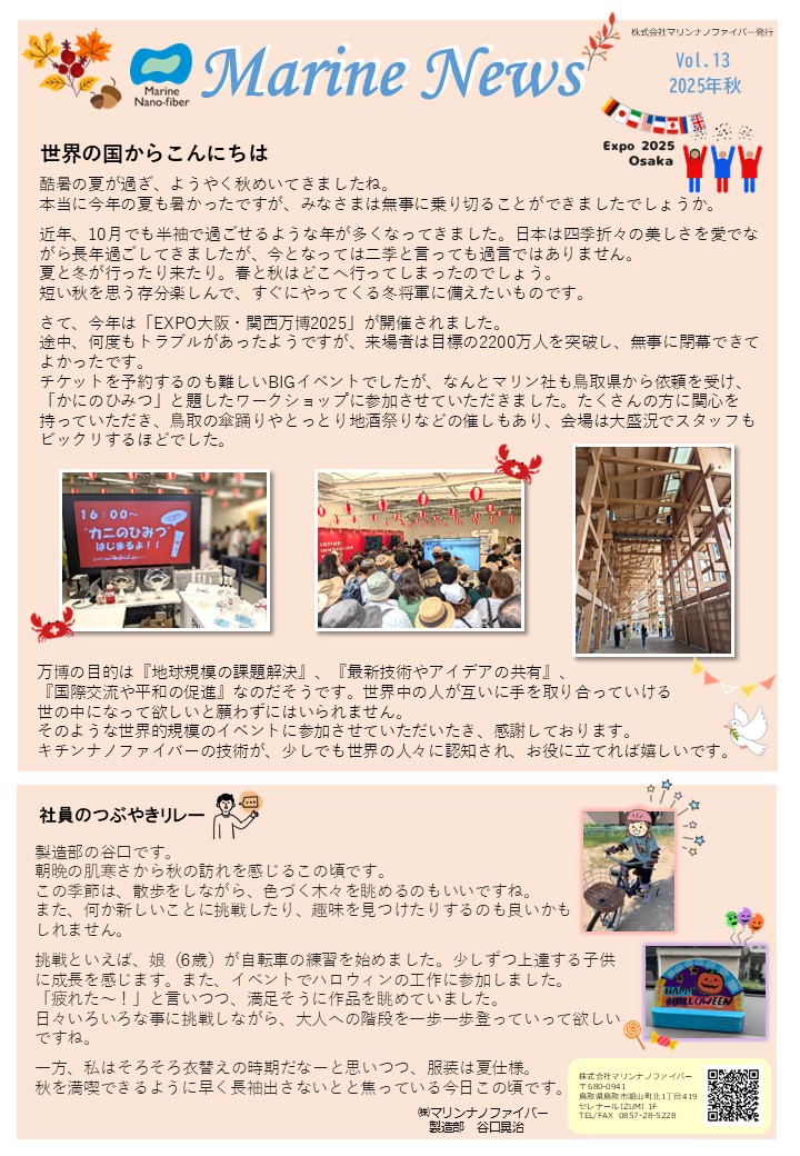 News 最新情報 ホーム 最新情報 ニュースレター『Marine News』… ニュースレター『Marine News』<Vol.13>2025年秋号 発行のお知らせ お知らせ 2025.10.15 ニュースレター『Marine News』<Vol.13>2025年秋号を発行しました。 今号は<先日閉幕した大阪万博に参加したイベントの様子>と<お子様への深い愛情が伝わる社員の声>です。 心温まる話題をお届けしています。 是非、ご一読ください♪ BACK